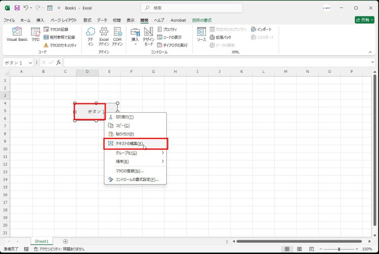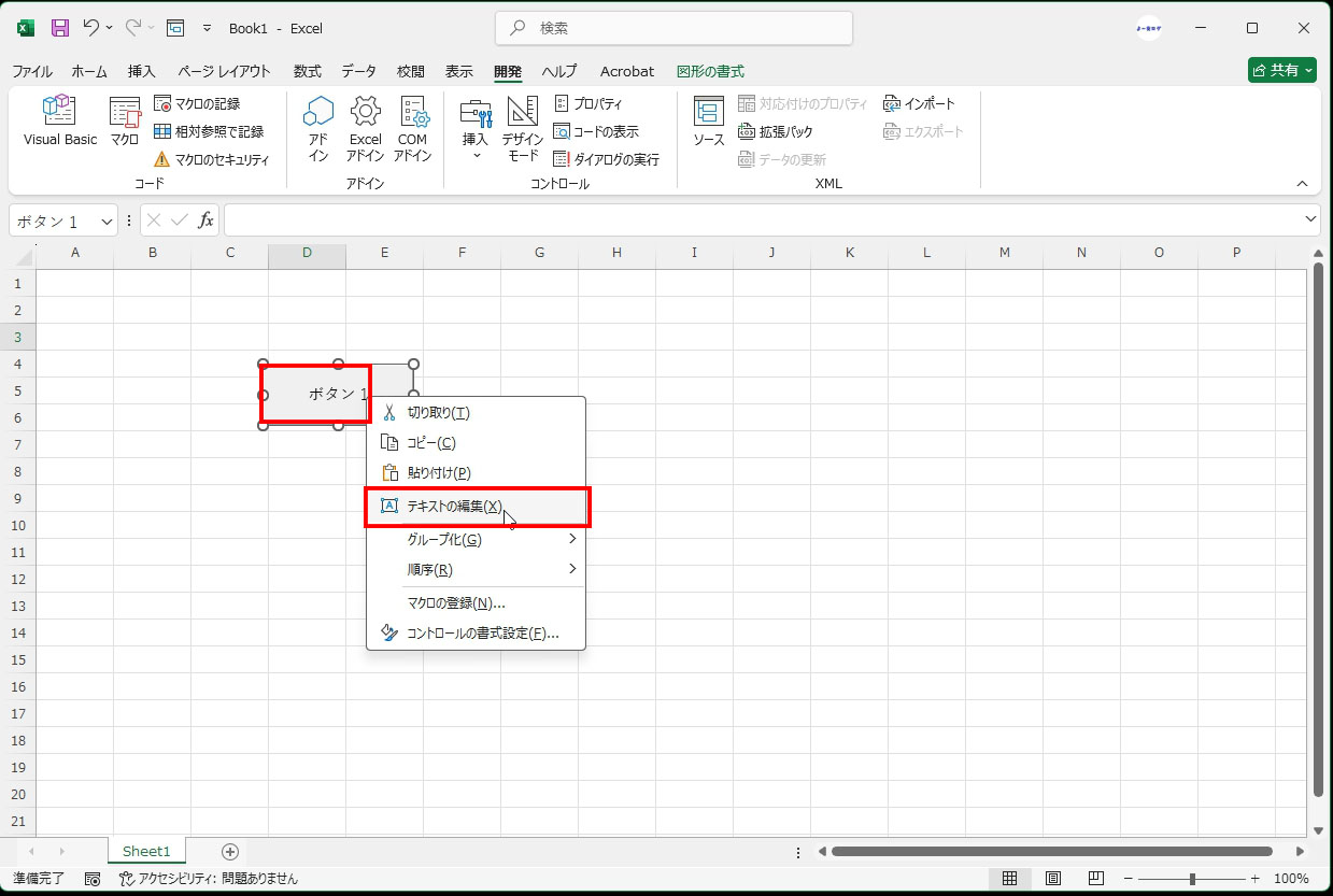 ボタンの上で右クリック → [テキストの編集] を選び、ボタンの名前(例:「データ一括集計」など)を書き換えます。