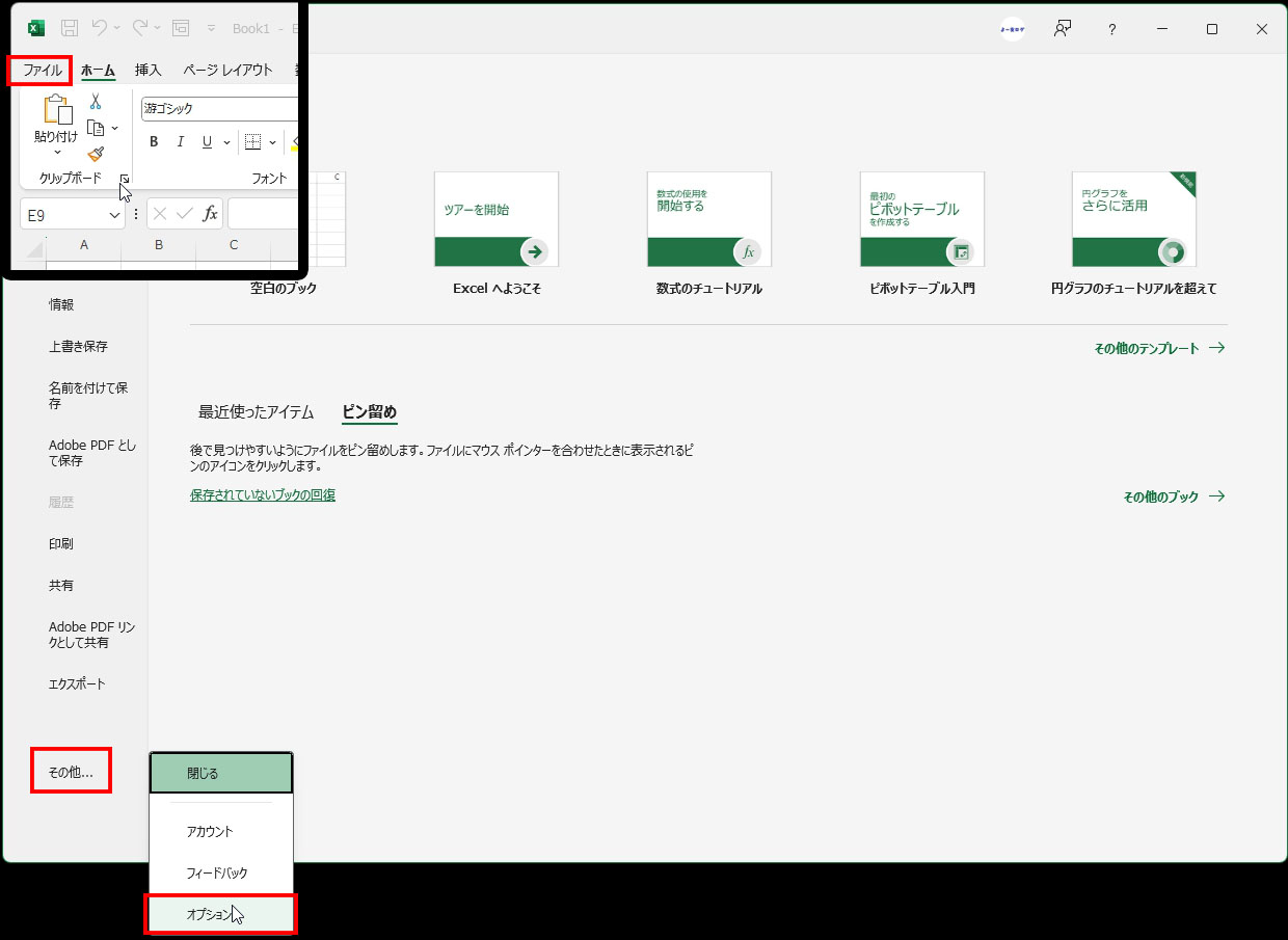 Excel左上の [ファイル] タブをクリックし左下の [オプション] を選択します。