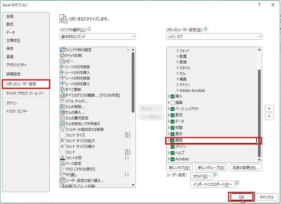 「Excelのオプション」画面が開いたら、左側の [リボンのユーザー設定] を選択します。右側のリストにある [開発] にチェックを入れて [OK] をクリック。