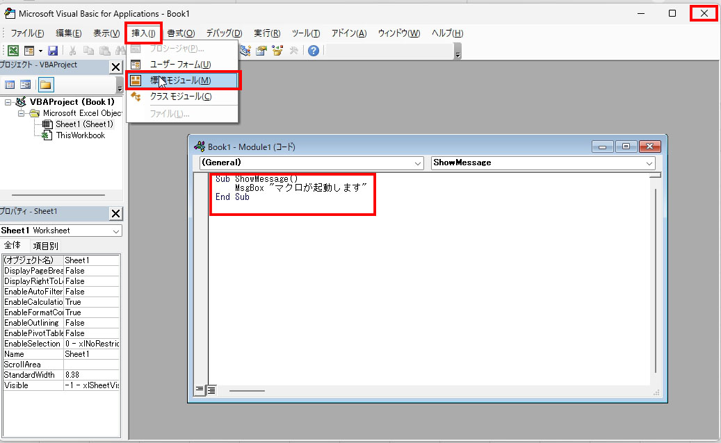 Subで始まりEnd Subで終わるもの)を貼り付けます。右上の「×」で画面を閉じます。