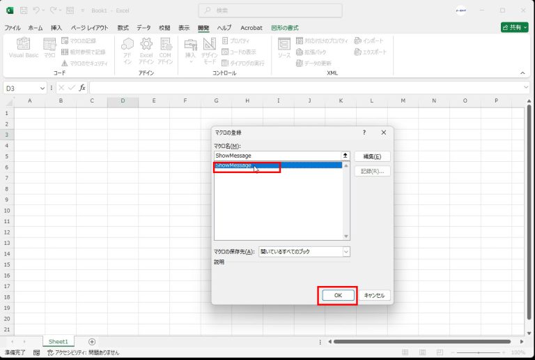 ボタンを置くと自動で「マクロの登録」画面が開きます。実行したい [マクロの名前] を選んで [OK] をクリック。